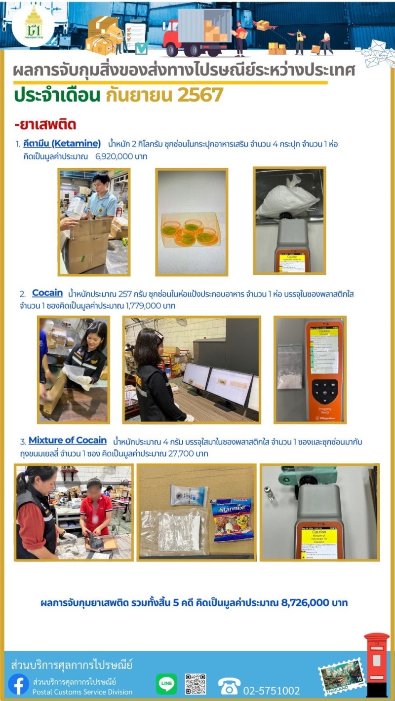 ผลการจับกุมสิ่งของส่งทางไปรษณีย์ระหว่างประเทศ ประจำเดือน กันยายน 2567 ยาเสพติด