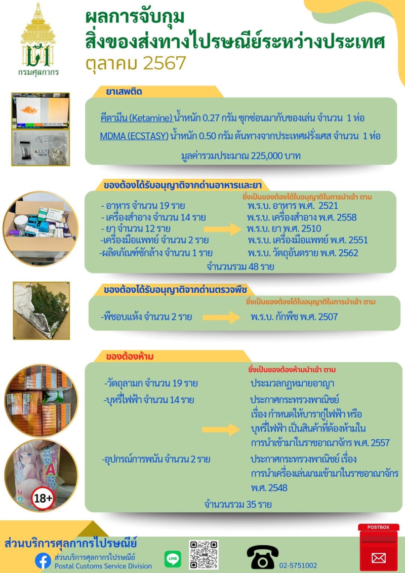 ผลการจับกุมสิ่งของส่งทางไปรษณีย์ระหว่างประเทศ ประจำเดือน ตุลาคม 2567