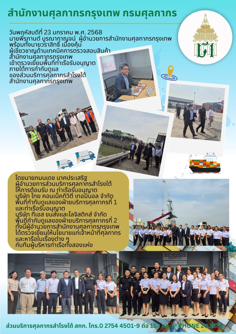เมื่อวันที่ 23 มกราคม 2568 นายพีรกานต์ บูรณากาญจน์ ผู้อำนวยการสำนักงานศุลกากรกรุงเทพ พร้อมทั้งนายวราสิทธิ์ เมืองคุ้ม