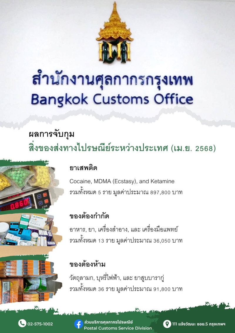 ผลการจับกุม สิ่งของส่งทางไปรษณีย์ระหว่างประเทศ ประจำเดือนเมษายน 2568