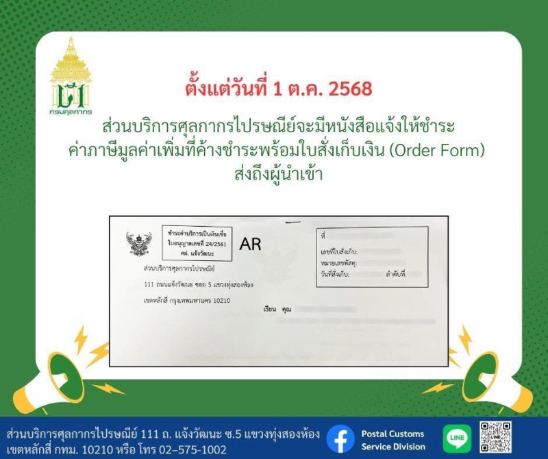 ตั้งแต่วันที่ 1 ต.ค. 2568 ส่วนบริการศุลกากรไปรษณีย์ จะมีหนังสือแจ้งให้ชำระค่าภาษีมูลค่าเพิ่มที่ค้างชำระพร้อมใบสั่งเก็บเงิน (Order Form) ส่งถึงผู้นำเข้า
